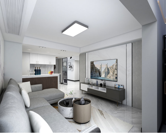 暖灰質(zhì)感的乳膠漆墻面為空間確定了大基調(diào),相對于純白,反而給出一股溫暖的筆觸。電視墻石膏板和乳膠漆結(jié)合,簡潔明了,舍棄繁瑣的裝飾,風格簡約。定制地柜,可以收納遙控器等客廳小件物品。