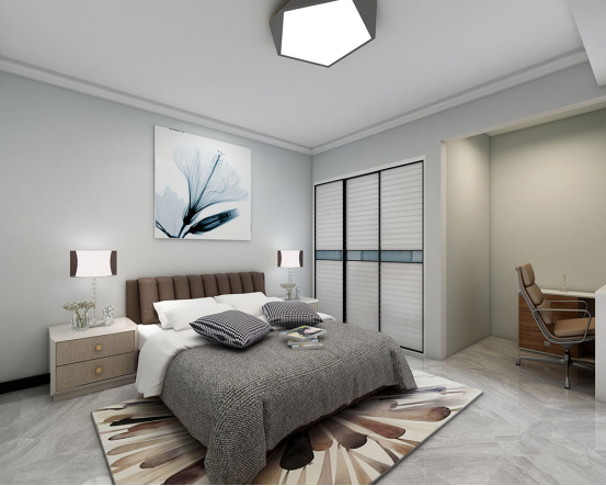 綠色條紋床品與北歐淺灰花色大理石,為空間增添了一份自然恬靜之感。定制床頭柜,方便放置書籍,滿足主人的睡前閱讀習慣。