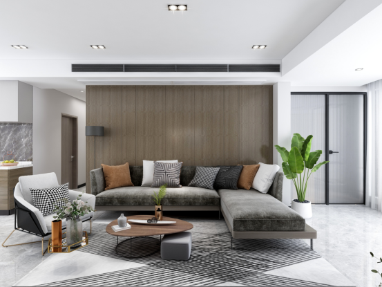 ▲客廳電視墻以優雅的咖啡色大理石為背景墻,壁掛上電視機,還有落地式的電視柜設計,呈現出大方端莊的視覺氛圍感。