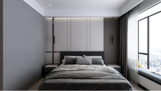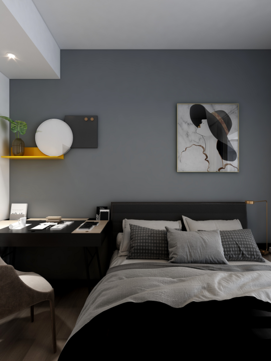 ▲臥室在灰色床頭墻的基礎,布置軟裝的床鋪,讓睡眠氛圍更加愜意輕松。書桌上方是展示擱板,整體空間輕盈自然。