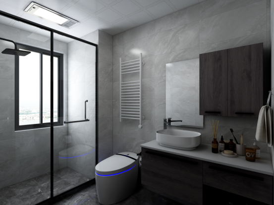 ▲衛生間黑色拉絲不銹鋼淋浴房邊框為整體效果增加了現代感,而天然的木色調清爽自然。