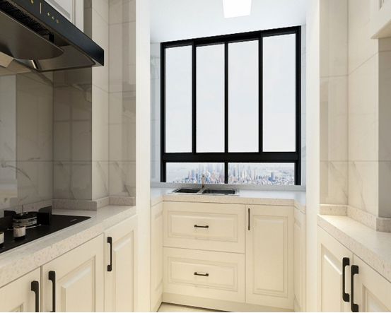 餐廳與客廳在一條線上,右手邊的廚房門改變位置,用柜子堵住原來廚房門的位置。