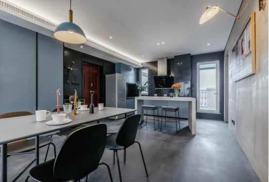 餐廳與客廳,沒有實物界線,只是用餐邊柜的藍色為公共空間劃分出隱形的分界。黑色的細線條穿插其中,金屬局部點綴,肌理和光澤匯聚成輕松的就餐空間。
