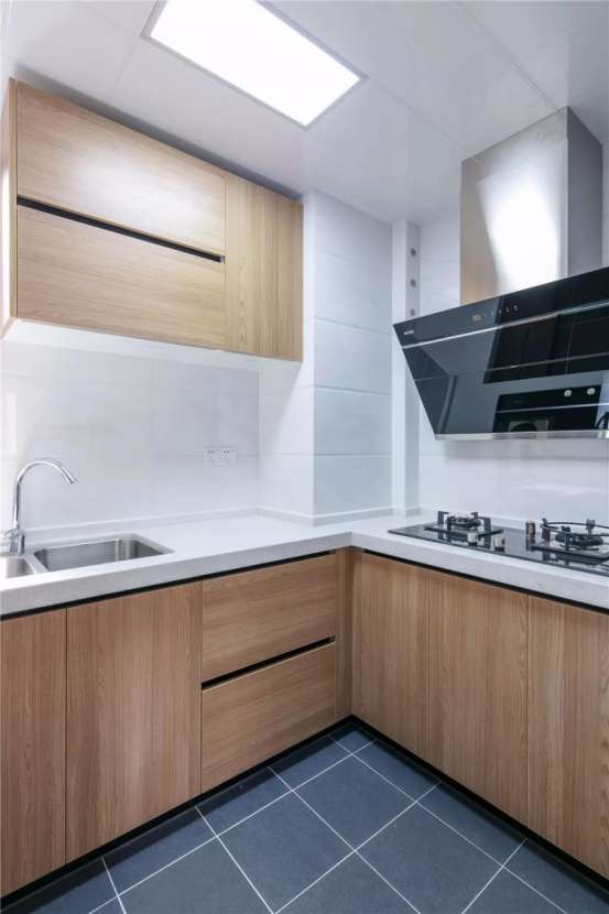 內部,白色墻磚、深灰色地磚,淺色臺面,櫥柜是原木色。