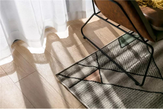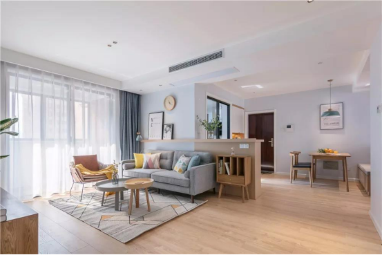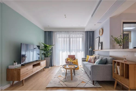 全貌,全屋通鋪木地板,客廳區域搭配的是灰色布藝沙發、原木色電視柜、小書柜。客廳采取無主燈設計,以頂面的筒燈為主要光源,落地式讀書燈為輔。