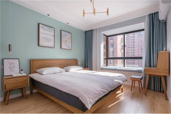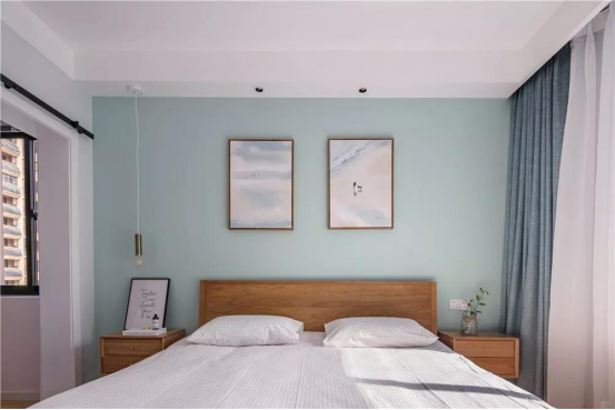 床頭的墻面用了淺藍綠色,搭配兩幅風景畫,入眼清爽簡約~