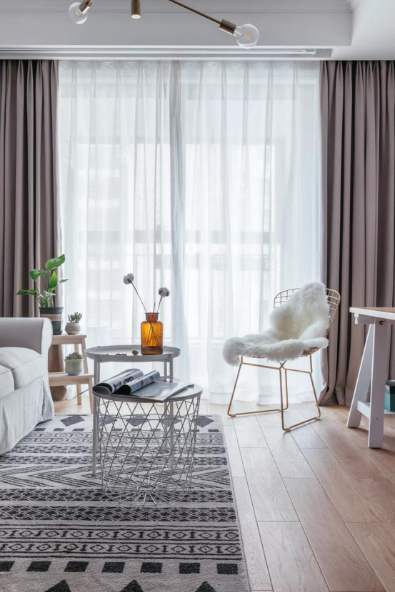 客廳布置很是輕盈,陽光透過薄紗,照在室內,一種朦朧的美感。簡單、舒適、好看得想馬上住進去。