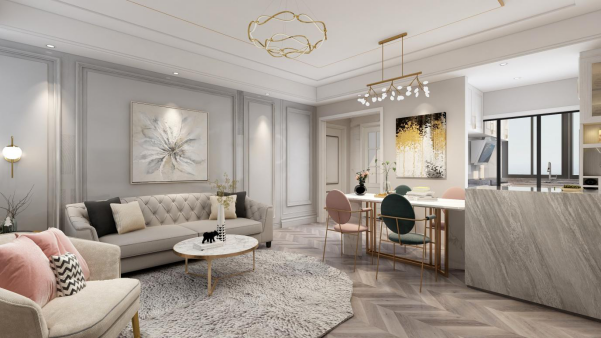 沙發背景墻是簡單的石膏線條,用裝飾畫做點綴突出時尚感,用線條的立體感、體現整體的淺色調,