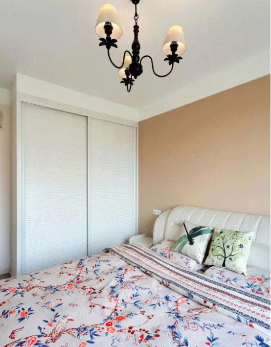 主臥很簡單,吊燈成了唯一的裝飾,十分清新舒適。