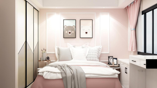 長輩的房間背景采用藍灰色的乳膠漆,和藍色的窗簾呼應,背景墻的深色和墻面的白色也形成了一個色差,使整個空間看起來干凈利落