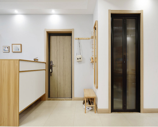 入門玄關(guān)設(shè)計(jì)了收納鞋柜,白色+原木柜體看起來簡(jiǎn)潔又大氣,生活氣息濃厚。旁邊擺放了換鞋子專 用凳子,以及衣帽掛鉤,十分方便。