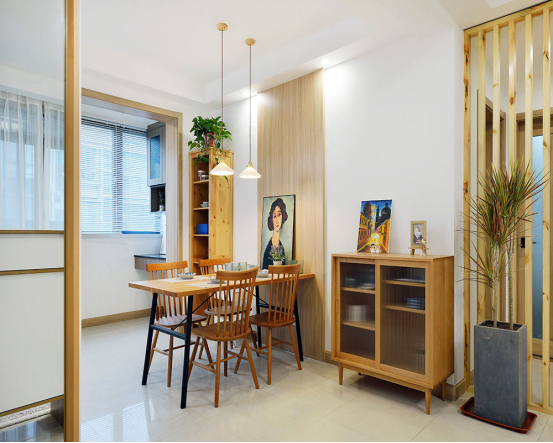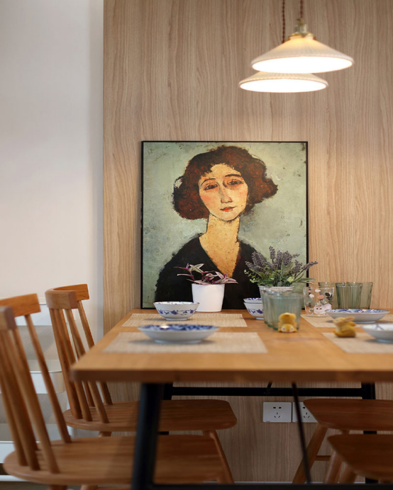 一整套原木色餐桌椅簡(jiǎn)單舒適,搭配糧食油畫,既不單調(diào),又增加許多趣味性。