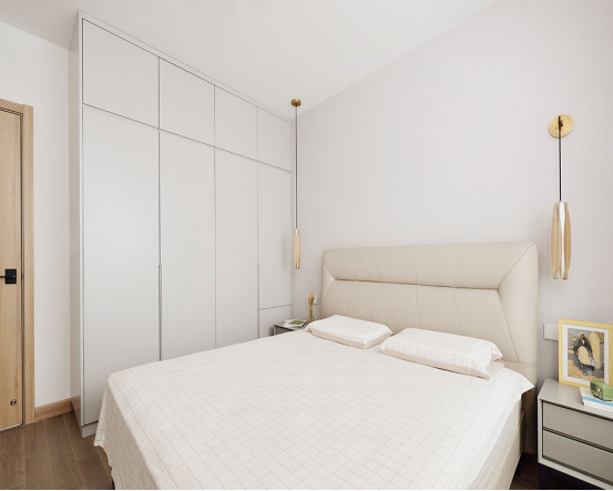 主臥搭配偏素淡,能讓人有心靈寧靜之感。房間里還設(shè)計(jì)了大衣柜,用來收納衣服,主臥采光度也十分棒。