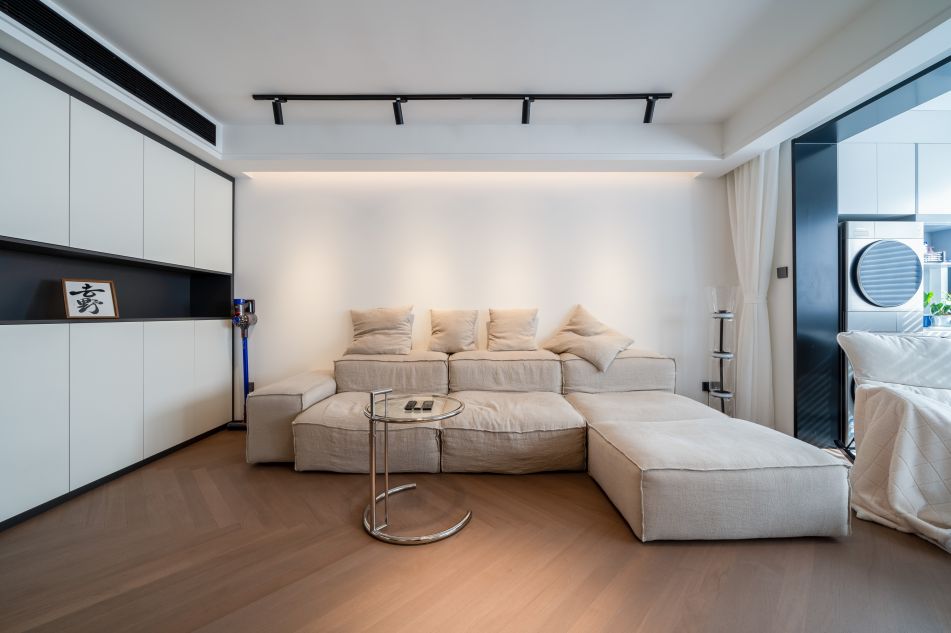 白色的主色調搭配了淺木色的地板,地板人字形鋪貼使空間看起來寬敞,且不失溫馨感。