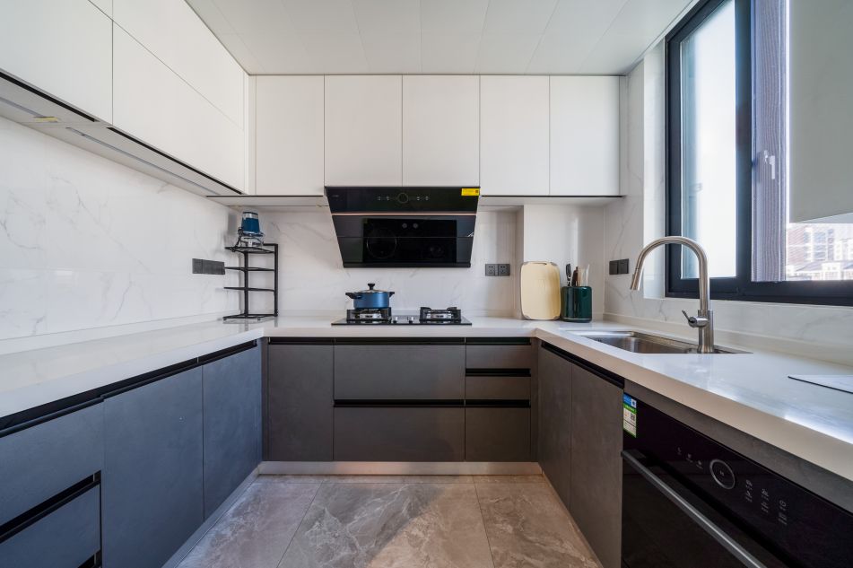 廚房做U型櫥柜,充足的收納空間與操作空間,簡約的風格和色調看起來更舒適。